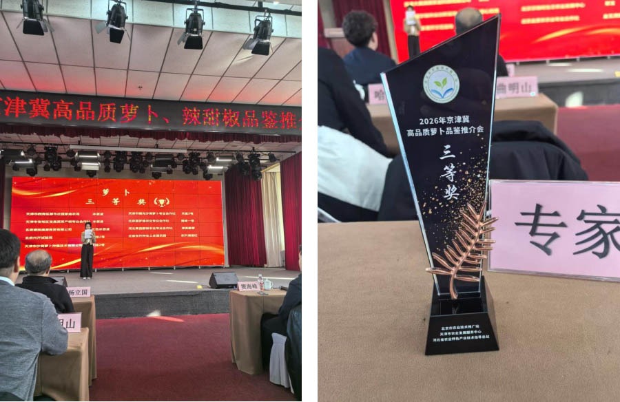 2026年1月20日,东升种业“满堂红”萝卜在京津冀高品质萝卜品鉴推介会中脱颖而出。在参评的86个水果萝卜品种中,是唯一获奖的心里美萝卜品种。